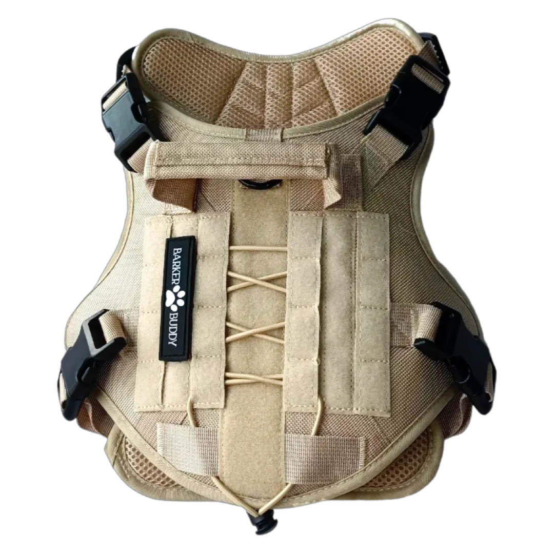 Customize the harness with patches. The Barker Buddy logo is a Velcro strap that allows you to move it around the harness.